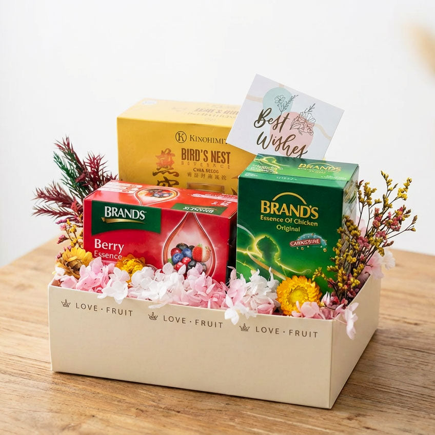 Designed to uplift both body and spirit, this Wellness Get Well Hamper features premium wellness products including bird's nest, chicken essence and berry essence, alongside gentle floral accents. Carefully arranged to express warmth and care, this hamper makes a thoughtful companion during recovery and rest.